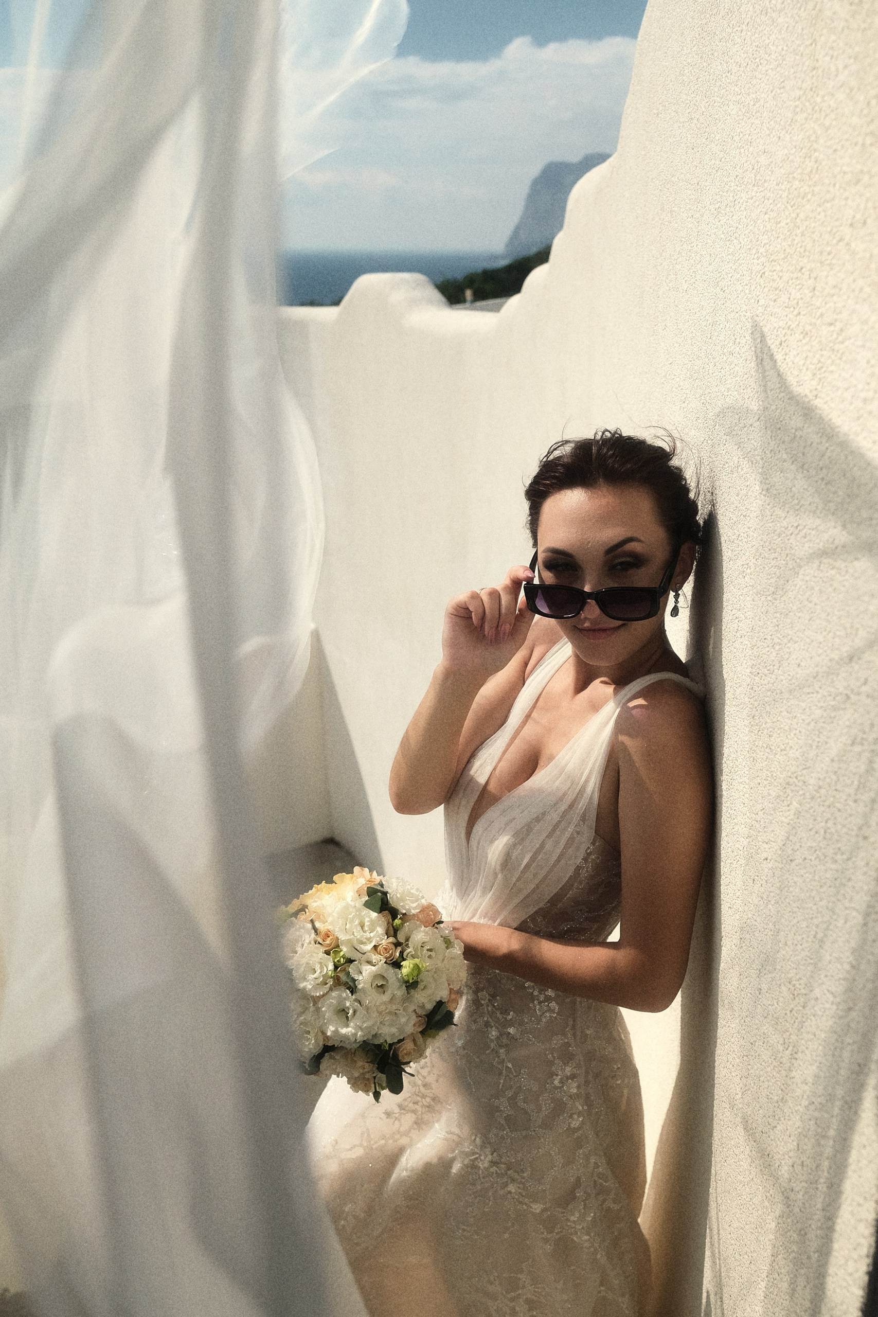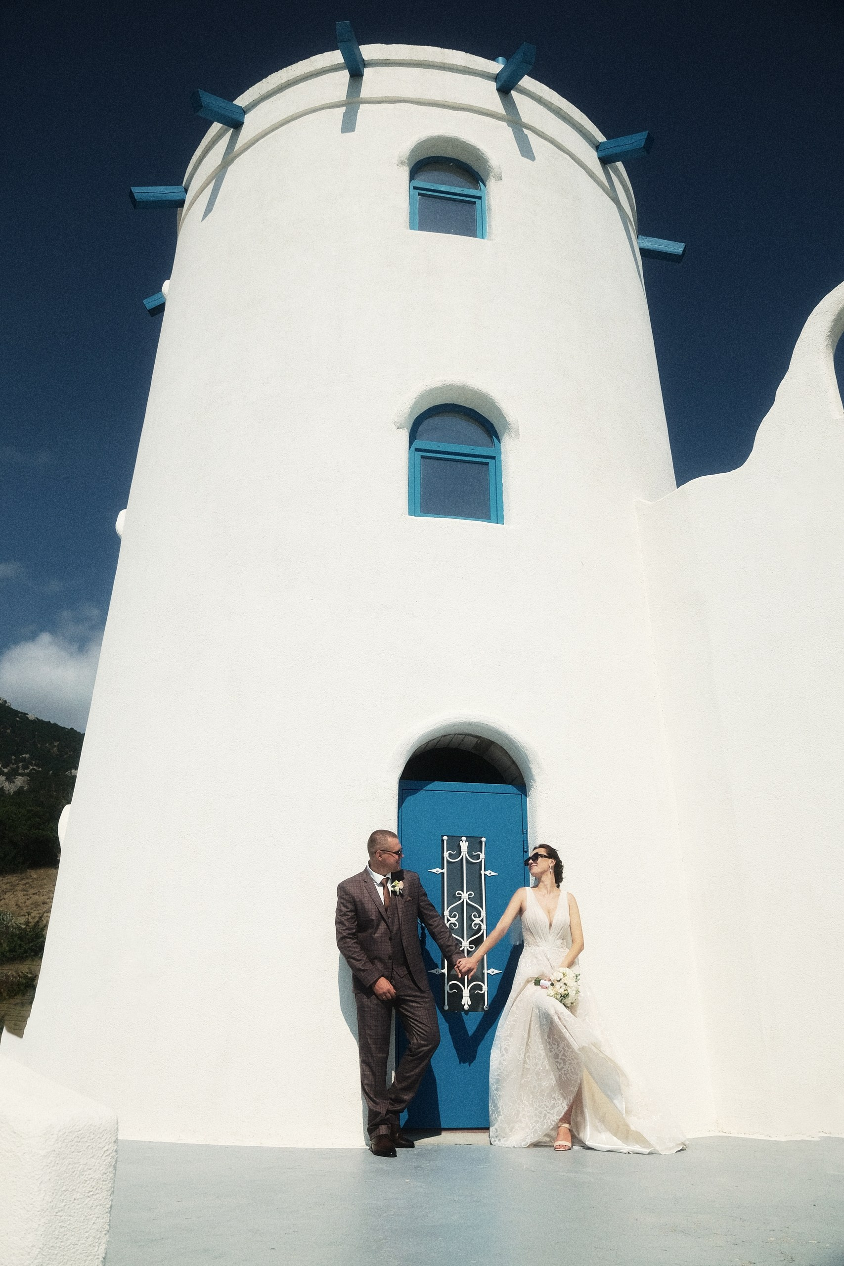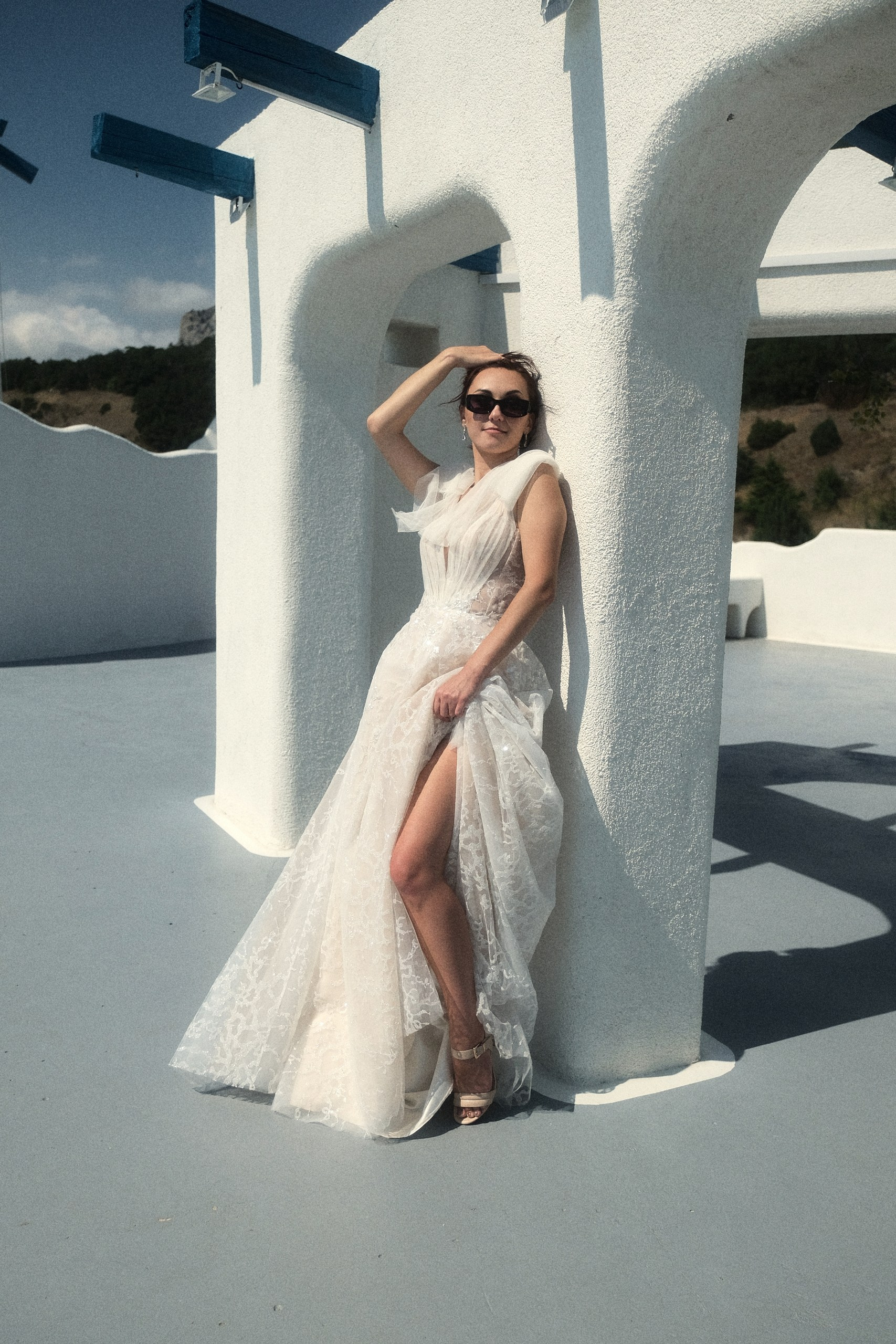 Очень светлая локация, результат съемки смотрится дорого, вкусно и эстетично благодарю белоснежному офорлению фасадов, голубым деталям экстерьера в стиле греческого Санторини и шикарному виду на море. Наиболее эффектные кадры получаются конечно же на закате, но и при сильном полуденном солнце тоже. Зависнуть в процессе съемки моно минимум на час. Так же данная локация подходит и для проведения выездных церемоний в любое время дня.
